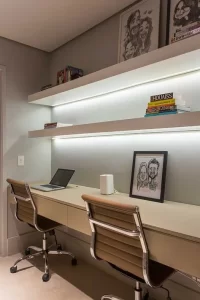 Mas isso não impede de se utilizar Temperatura de Cor quente em outras luminárias, principalmente se o home-office estiver instalado em um outro ambiente da casa, como no quarto ou na sala por exemplo. Em complemento é possível integrar luminárias LED à marcenaria ou usar abajures para dar o toque final a decoração.